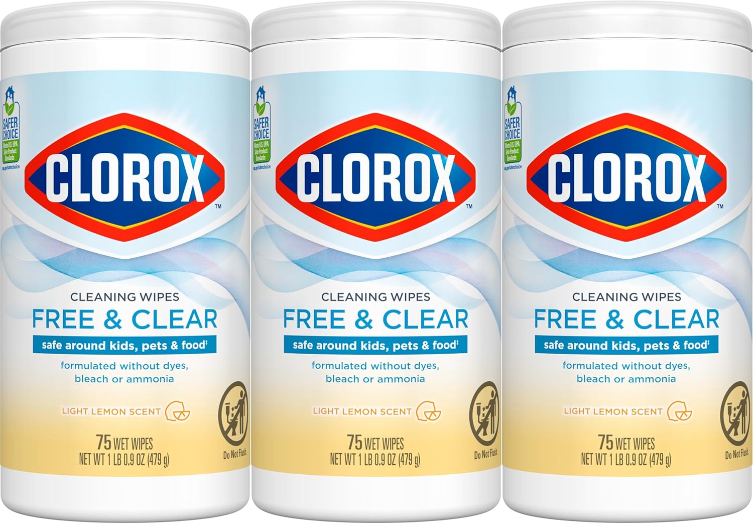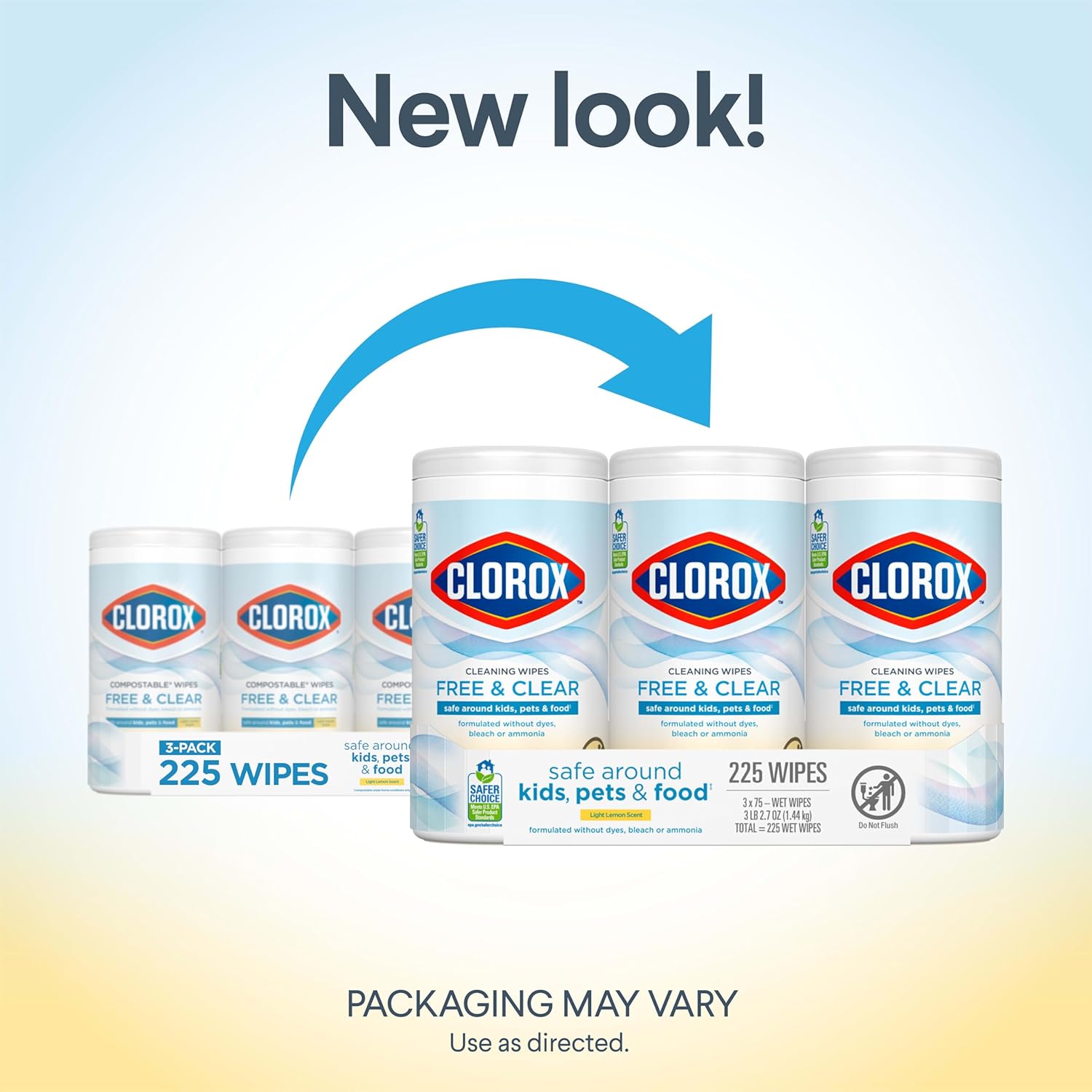Clorox Free & Clear Cleaning Wipes. Light Lemon Scent. 75 Count. Pack of 3 (Pack May Vary)